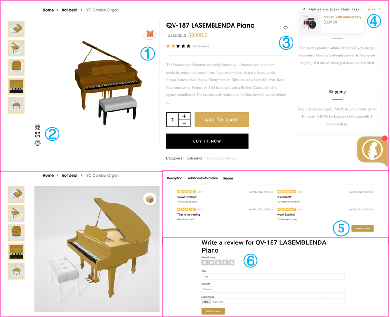 Motivation and design: The reason for our implementation of displaying 3D instruments is to enhance customers’ immersive shopping experience. It is not enough to attract customers by simply showing some pictures of instruments. Instead, we want to give customers a more comprehensive overview of instruments by showing them from all angles. If customers can interact with 3D instrument models, they are more likely to buy them, contributing to the growing profits of the online instruments store.