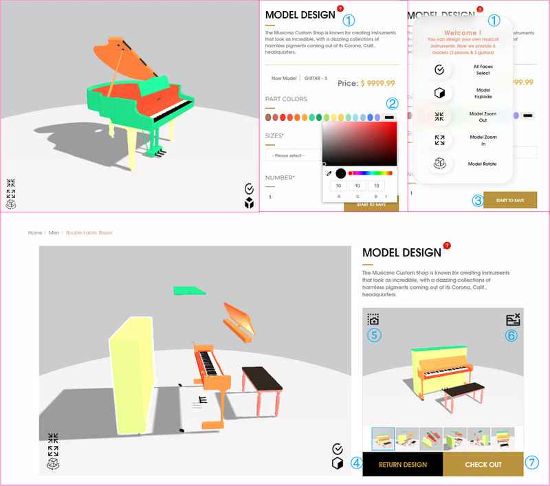 Motivation and design: Current e-commerce does not provide customers with an immersive experience, and products are intangible to them. The intrinsic disadvantages may distract customers from actually buying. Moreover, the display of products on e-commerce are selected by sellers without considering customers’ actual needs. To alleviate those problems, our project allows users to interact with 3D models and customise their preferred instruments and save the customised model for further ordering and delivery. In this way, customers can have immersive shopping experiences, and employees can potentially have growing profits by better catering to customers’ needs through 3D instrument customisation.