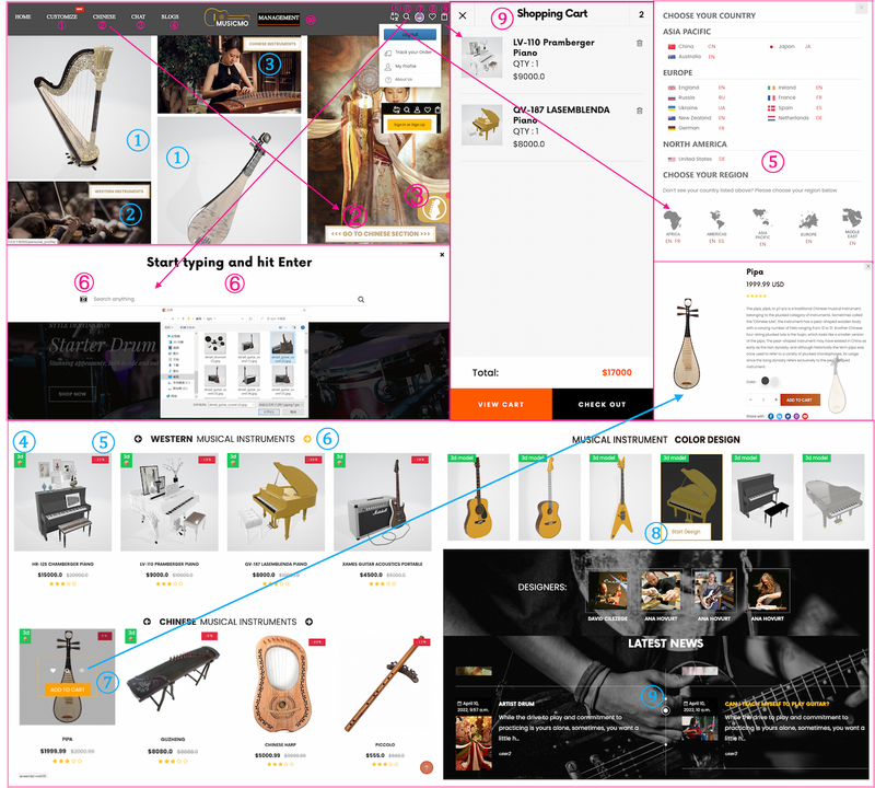 Our project aims to develop an attractive online instruments shop for a family-owned shop to alleviate the aforementioned problems. Firstly, our project has essential functions for online shopping. Secondly, to give customers immersive shopping experience, our project employs the usage of 3D instruments preview and instruments playing games on our website. Thirdly, our project is original in allowing customers to interact with 3D models to customise their preferred instruments, which have not gained much prevalence in current e-commerce. Most importantly, our project features intelligence, such as instrument recognition and search based on Machine Learning (ML) and Information Retrieval (IR) and AI customer service based on Natural Language Processing (NLP).