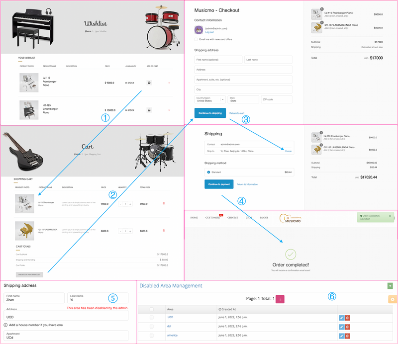 Design and implementation: We design four order related tables in the database: order, uncompleted_order, order_item, and uncompleted_order_item. When customers click the “Order" button on the shopping cart or instruments details page, they will be directed to the input address. After customers confirm their input, the back-end will create an uncompleted_order_item for each instrument in the order with the uncompleted_order as the foreign key. Moreover, the uncompleted_order stores the information entered by the customer. Subsequently, our website displays the payment page where the customer selects the payment method and confirms their payment. After the confirmation, the back-end generates order_item for each created uncompleted_order_item, and this order_item points to the key that stores the order as a foreign key, and the order stores the information inside the uncompleted_order and the user’s payment information. Then the uncompleted_order and its corresponding uncompleted_order_item will be deleted. The order is made successfully, and the administrator can view the order and modify its status. If customers exit the page without paying for the order, the uncompleted_order will be reserved for the customer to finish afterwards.